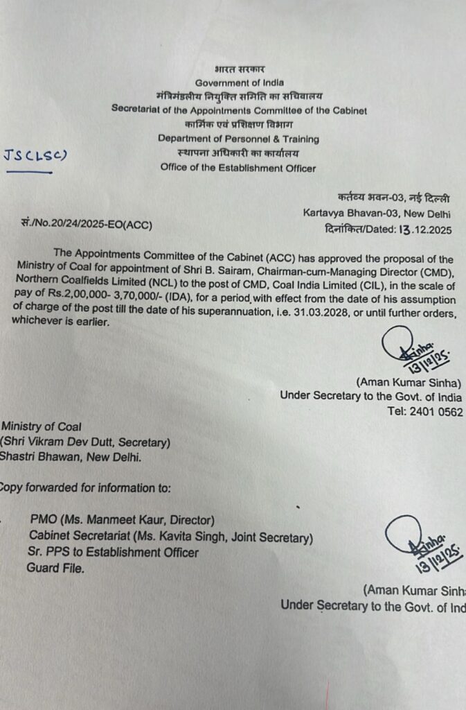 Ending months of speculation, the Appointments Committee of the Cabinet (ACC) has approved the appointment of B. Sairam, currently Chairman and Managing Director (CMD) of Northern Coalfields Limited (NCL), as the next Chairman of Coal India Limited (CIL).