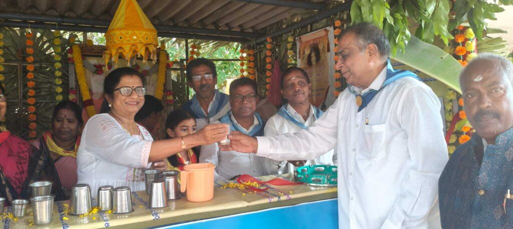 Smt. Leena , Deputy General Manager (Materials Management), RINL and wife of Dr. Salim G. Purushothaman, Director(Operations), Visakhapatnam Steel Plant, inaugurated the Chalivendram organized by the Ukkunagaram Sri Sathya Sai Seva Samiti at the Visakha Steel General Hospital Bus Stop of Ukkungaram Township of Visakhapatnam Steel Plant, amidst auspicious Vedic chanting. The Chalivendram, set up by Sri Sathya Sai Seva Samiti, Ukkunagaram,is a much-awaited summer initiative that has been serving the public with cool drinking water and fresh buttermilk during the scorching summer months for over 33 years.