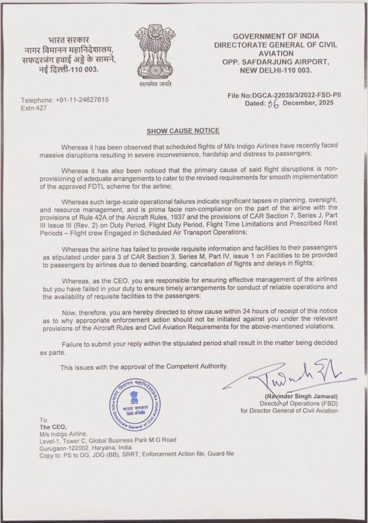 The Directorate General of Civil Aviation (DGCA) has issued a strongly worded Show Cause Notice to IndiGo, holding the carrier accountable for widespread disruptions and lapses in operations.