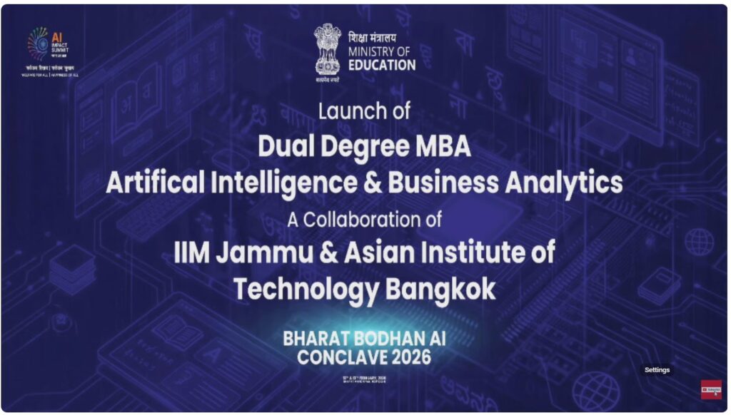 In a significant step toward strengthening India’s AI-driven education ecosystem and advancing the vision of Viksit Bharat 2047, Union Minister of Education Dharmendra Pradhan formally launched the Dual Degree MBA Programme in Artificial Intelligence and Business Analytics — a joint initiative of Indian Institute of Management Jammu and the Asian Institute of Technology.