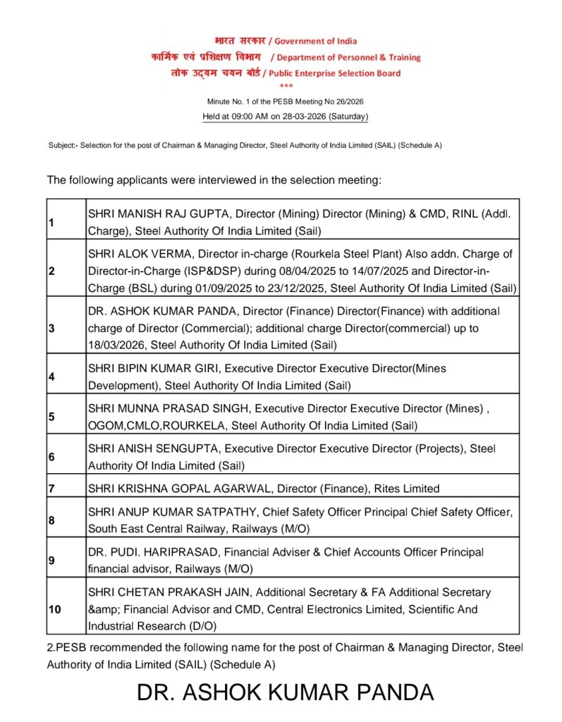 Public Enterprises Selection Board has recommended Dr. Ashok Kumar Panda, Director (Finance), Steel Authority of India Limited, for the post of Chairman and Managing Director (CMD) of the steel major.