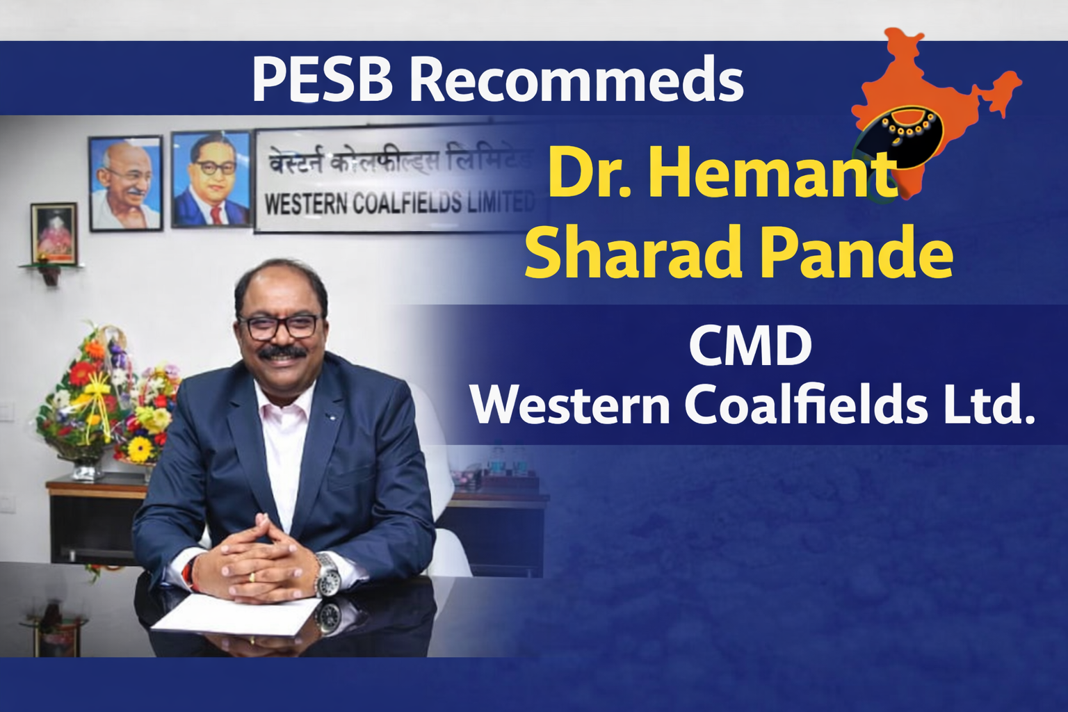 In a significant leadership development in the coal sector, the Public Enterprises Selection Board (PESB) has recommended the name of Dr. Hemant Sharad Pande, Director (Personnel), Western Coalfields Limited (WCL), for appointment as the next Chairman and Managing Director (CMD) of Western Coalfields Limited, a key subsidiary of Coal India Limited.