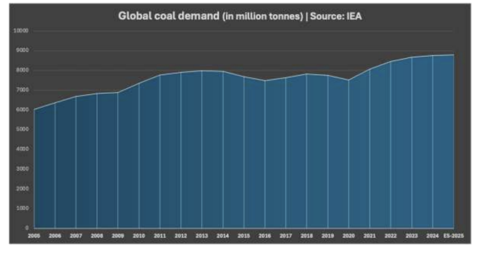 The second decade marks a visible slowdown, increased volatility, and significantly weaker growth momentum. Coal demand rose from just under 8 billion tonnes in 2015 to around 9 billion tonnes in 2024—an increase of only ~1 billion tonnes over ten years.