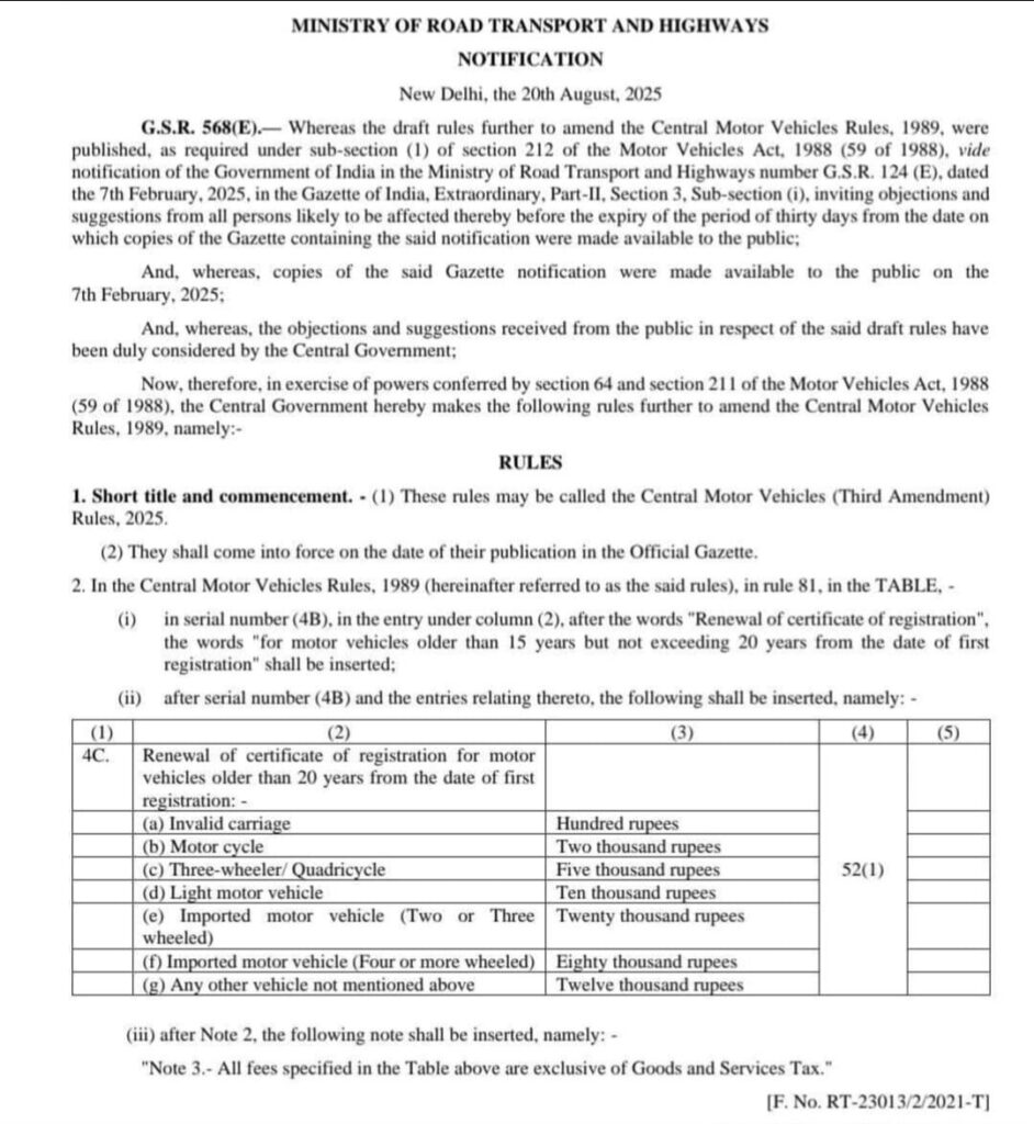 In a major relief to vehicle owners across the country, the Ministry of Road Transport and Highways has notified that vehicles older than 15 years will now be allowed to remain on roads for an additional five years, subject to renewal of registration. Vehicle owners will have to pay a prescribed fee for the extension of registration.