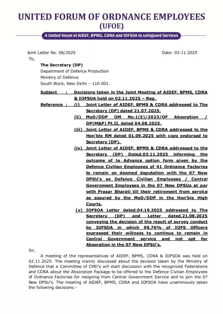 Citing this assurance, federations and the Confederation of Defence Recognised Associations (CDRA) have repeatedly urged the Ministry of Defence to issue a formal notification safeguarding employees’ service conditions. AIDEF has even served a Contempt of Court notice to the Secretary (Defence Production) and the CMDs of the seven DPSUs, following the government’s move to reduce sanctioned strength across various categories and to appoint a committee headed by retired IAS officer Suresh Chandra to examine absorption-related matters.