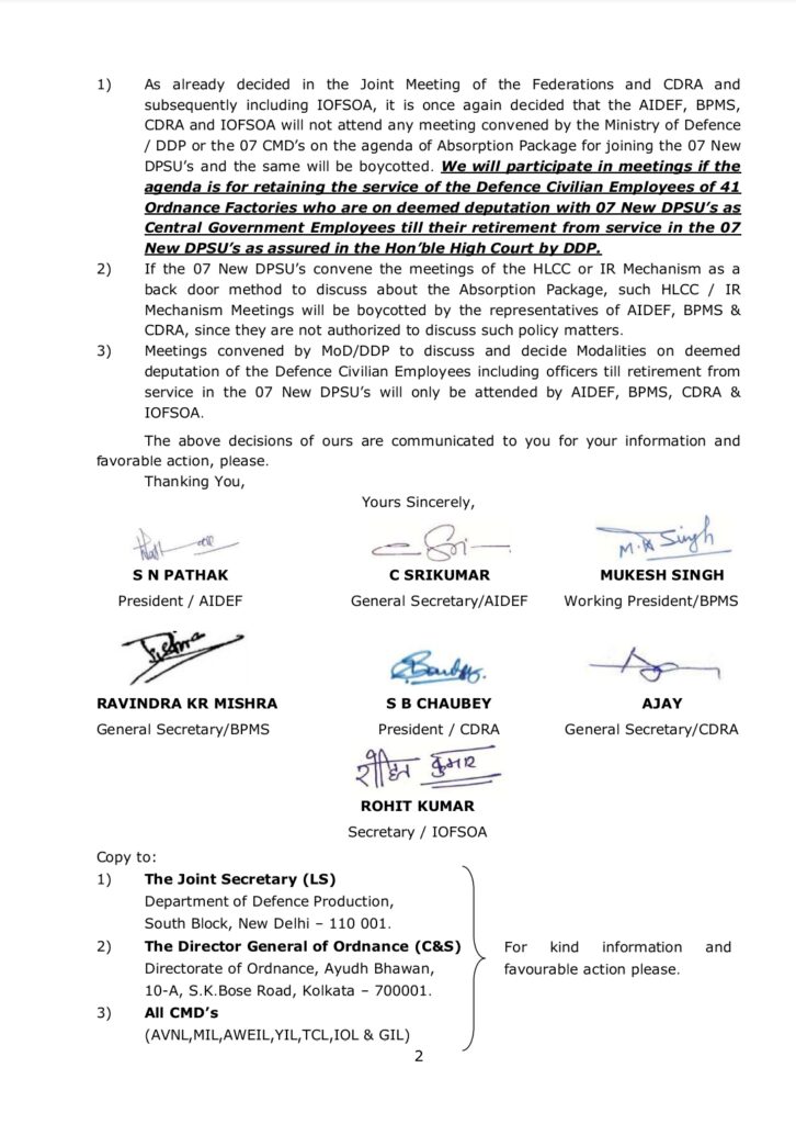 The Indian Ordnance Factories Service Officers’ Association (IOFSOA) has joined hands with various defence employees’ federations to boycott the proposed meeting on the Absorption Package of the seven newly created Defence Public Sector Undertakings (DPSUs).