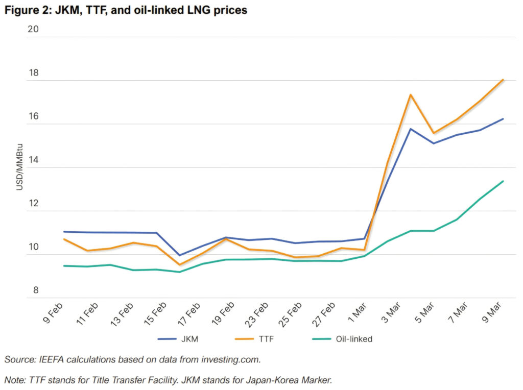 Most countries in Asia lack underground gas storage, exposing them more directly to price spikes in global gas markets. The Japan-Korea Marker (JKM), Asia’s LNG spot benchmark, spiked 50% between 27 February and 9 March 2026 (Figure 2). Bangladesh purchased a cargo at USD28.28 per million British thermal units (MMBtu) — nearly three times JKM prices last month — while Pakistan has halted LNG purchases altogether.