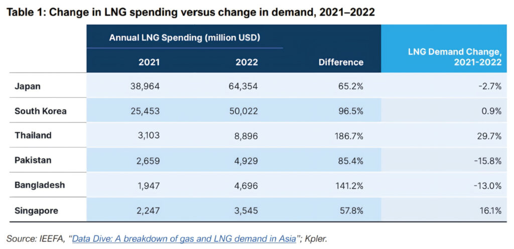 Extended price spikes for US dollar-denominated fossil fuels can cause annual import bills to skyrocket, even if demand declines. Following the Russian invasion of Ukraine in 2022, annual LNG spending in both Pakistan and Bangladesh more than doubled compared to 2021, even though imports declined by 16% and 13%, respectively. In Japan, LNG demand fell by nearly 3%, but annual spending increased 65% (Table 1).