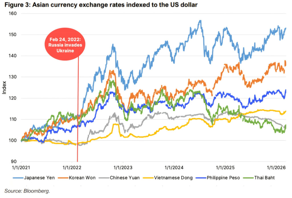 The result is a significant drawdown in foreign exchange reserves and a depreciation of local currencies. All net oil and gas importing countries in Asia experienced currency depreciation against the US dollar in 2022 (Figure 3). In the first seven days of the Iran conflict, emerging market currencies faced their worst week since 2020, as traders flock to safe havens in gold and US dollars.