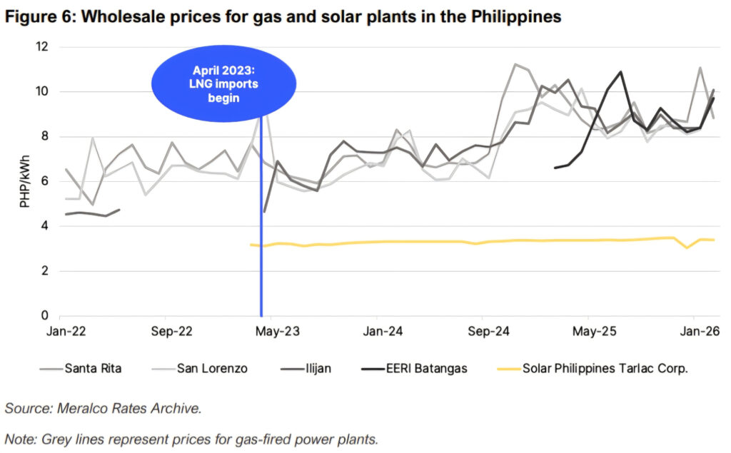 A recent IEEFA analysis of Thailand’s power markets shows the significant variation in gas-fired power prices sold to EGAT (Figure 5). Prices regularly exceed THB4 per kilowatt-hour (USD130/MWh) when plants operate at lower capacity, as fixed capacity payments are amortized over lower output. In the Philippines, the introduction of LNG in 2023 has caused a persistent increase in gas-fired power costs for Meralco, the country’s largest distribution utility, in stark contrast to the stable prices offered by solar (Figure 6).