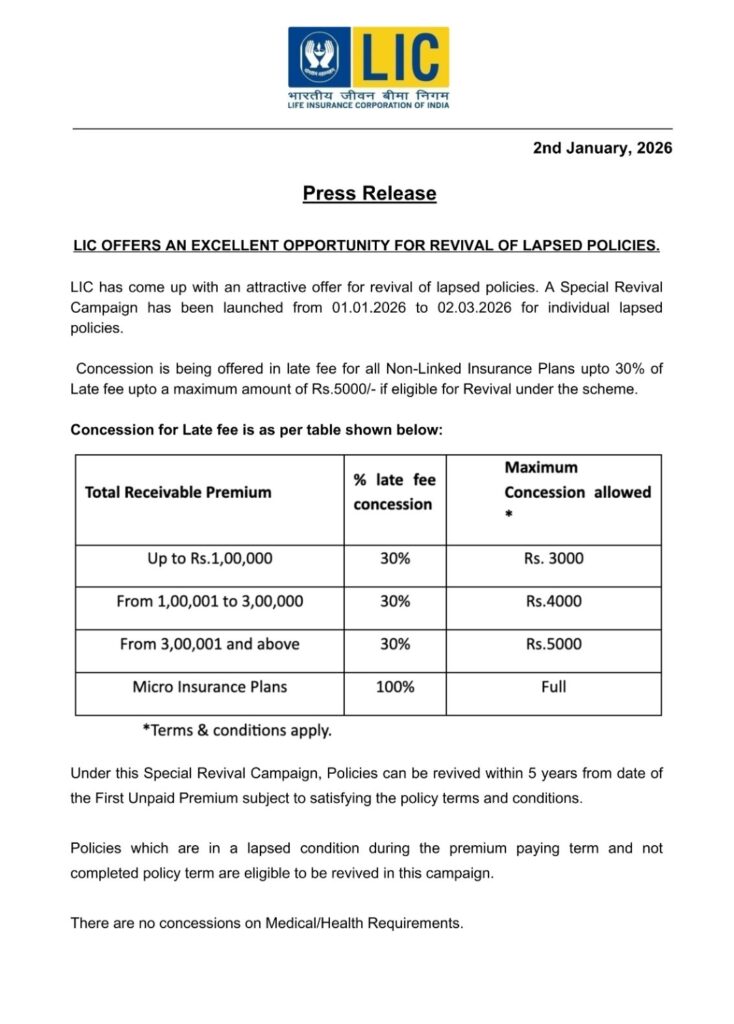 Policyholders looking to take advantage of this window are advised to contact their LIC branch or agent at the earliest, as the campaign is time-bound and ends on March 2, 2026.