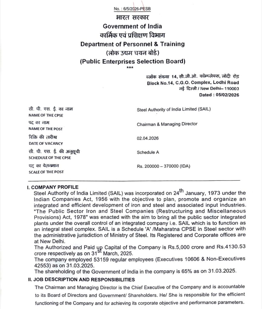 Public sector headhunter Public Enterprises Selection Board (PESB) on Tuesday notified the vacancy for the post of Chairman, SAIL, with applications open until 26 February 2026 (3:00 PM). The position is scheduled to be filled by 1 April, marking the effective end of Prakash’s stewardship—well beyond his original tenure completion date.