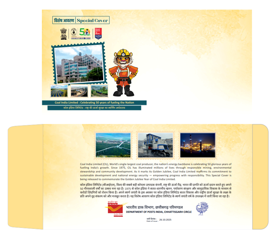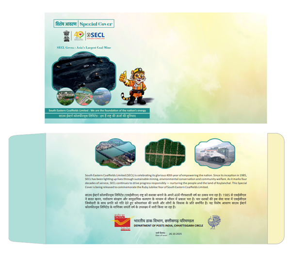 Issued in collaboration with the Department of Posts, Chhattisgarh Postal Circle, the Special Cover is a collectible philatelic tribute celebrating landmark achievements in India’s industrial and institutional history. It highlights Coal India’s five-decade legacy of powering the nation and SECL’s four decades of operational excellence and innovation in coal mining.