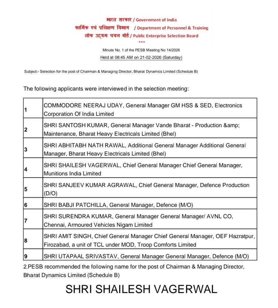 PESB Selects Shailesh Vagerwal as Next CMD of Bharat Dynamics Limited