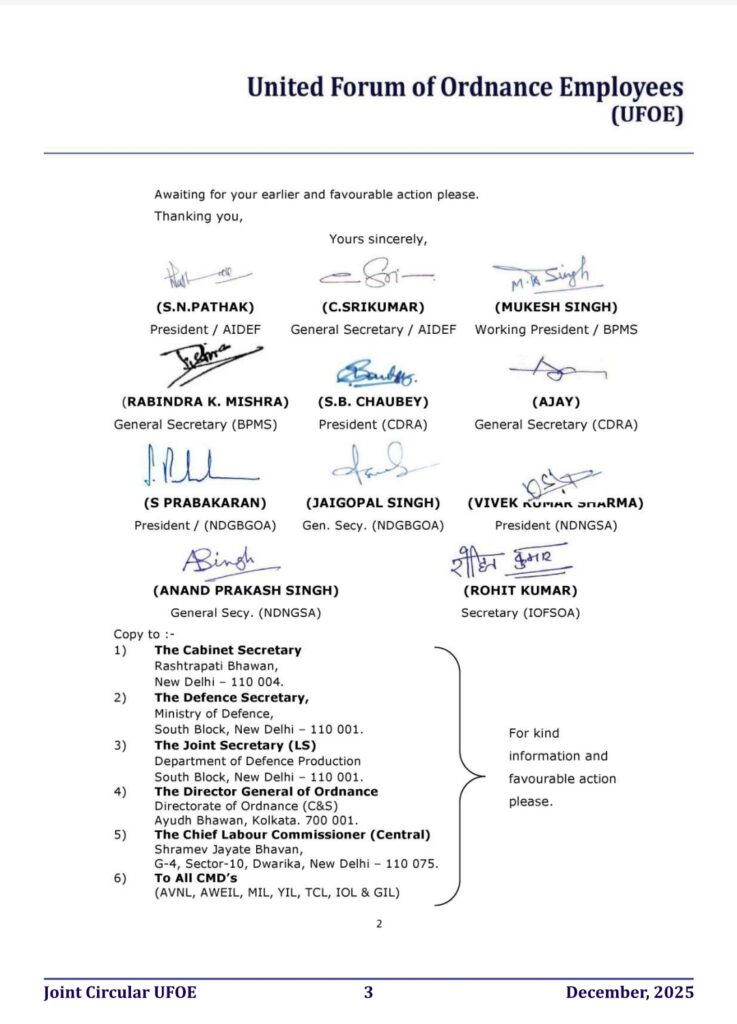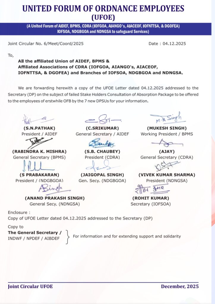 The United Forum of Ordnance Employees (UFOE) has strongly urged the Department of Defence Production (DDP) to immediately publish a Gazette Notification confirming that all Ordnance Factory employees—currently on deemed deputation to the seven newly formed Defence Public Sector Undertakings (DPSUs)—will continue as Central Government employees till retirement, as assured earlier by the Government and the Ministry of Defence.